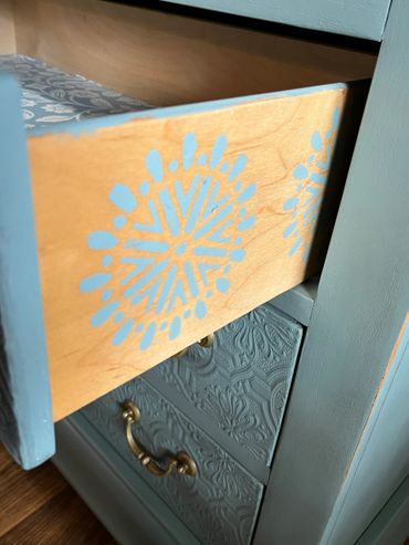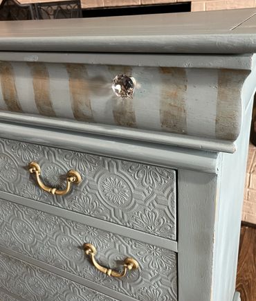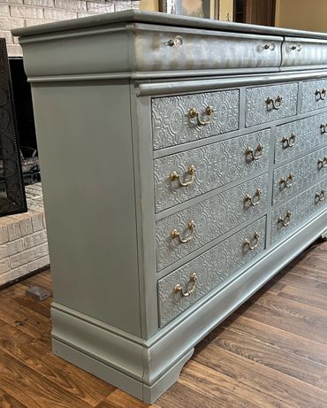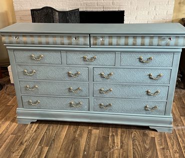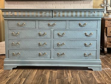 This exquisite 11-drawer dresser measures 68" wide, 18" deep, and 41" high. It features a pretty finish of vintage duck egg blue, complemented by elegant gold stripes and hardware, creating a beautiful focal point for any bedroom or living space. Restored to like-new condition, it offers ample storage with its spacious drawers, making it both a functional and stylish addition to your home decor. Similar pieces purchased new will cost over $1000! We also offer free delivery within 30 miles of Canton, Texas.